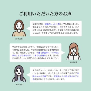 | 使用方法 | 化粧水や美容液などでお肌を整えた後にご使用ください。 (1)手のひらに適量(10円玉大)のジェルをとり、お肌の数ヶ所に分けておきます。 (2)お顔に満遍なく塗ります。 (3)5~10分程でジェルが固まり、お肌に膜を張ります。 (4)そのまま就寝します。 (5)翌朝ぬるま湯で洗い流してください。洗顔の必要はありません。 *ジェルを塗る際はマッサージなどしないようにしてください。 *週に1~2回のご使用をおすすめいたします。特にお肌が弱っているときは集中ケアとして毎日ご使用いただけます。 |